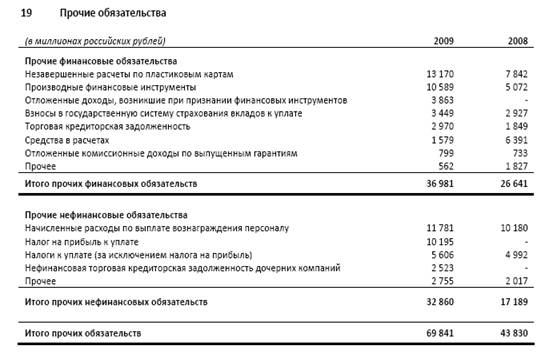 Причинами данного изменения является увеличение задолжности по операциям с производными финансовыми инструментами (увеличение в 2,08 раза); а также увеличение задолжности по пластиковым карточкам на 67,9%; увеличение количества сотрудников вышедших на пенсию на 11,7%, связи, с чем увеличилось количество пенсионных обязательств на 1516 миллионов рублей за 2009 год по сравнению с 2008 годом.