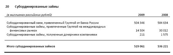 По состоянию на 2009 год наблюдается общая тенденция сокращения суммы субординированных займов (долгосрочный заем со сроком не менее 5 лет) на 3,3% по отношению к 2008 году. Как видно из таблицы наблюдается снижение суммы субординированного займа перед Банком России, то есть Сбербанк производит поэтапное погашение ранее полученных займов.