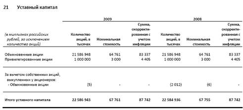 По состоянию на 31 декабря 2009 года номинальная стоимость обыкновенных и привилегированных акций составила 3 рубля за акцию, что в сумме составило по обыкновенным акциям – 64761 миллионов российских рублей, а привилегированных – 3000 миллионов российских рублей. Хотя сумма уставного капитала осталась не изменой, но натуральное количество акции увеличилась так, как была произведена продажа ранее выкупленных собственных обыкновенных акции в количестве 2007 тысяч штук.