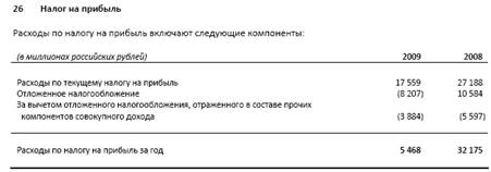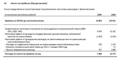 В таблице наблюдается сокращение расходов по налоговом отчислением на 83,1% , причинами этому является снижение прибыли на 100057 миллионов российских рублей в 2009 году в связи с Мировым Финансовым кризисом. Одной из мер государства по борьбе с кризисом и поддержке банковского сектора было снижение процентных ставок по налогам на прибыль с 24% до 20% в 2009 году.