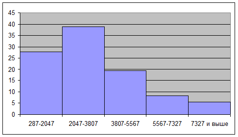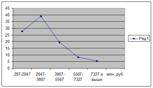 Наибольшее число банков 24 или 66,7% имеют стоимость вложений в ценные бумаги от 287 до 3807 млн. руб. Наименьшее число банков 2 или 5,6% имеют наибольшую стоимость вложений от 7327 и выше.