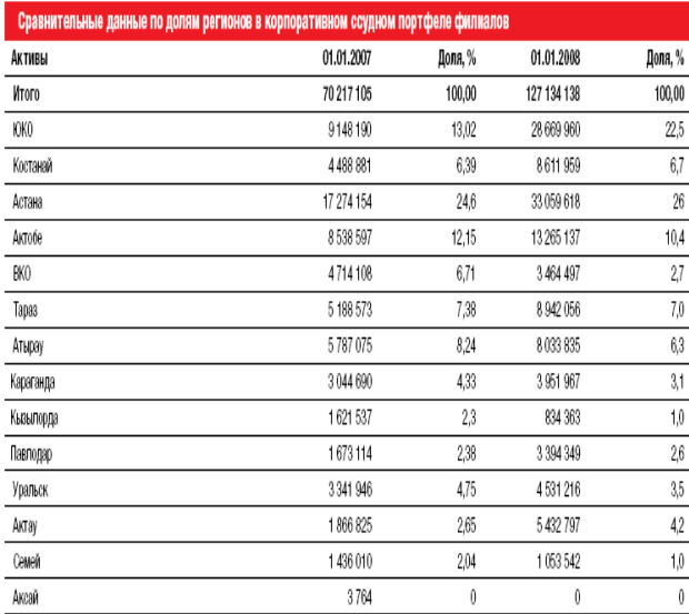 По состоянию на 01.01.2008 г. Общий остаток ссудной задолженности корпоративного блока Банка поставил 462 956 553 тыс. тенге. По сравнению с 01.01.2007г. наблюдается увеличение величины корпоративного кредитного портфеля на 38,2%. Доля корпоративных кредитов в общем кредитном портфеле Банка в 2007 г. Составила 61,3%. Доля корпоративных кредитов филиалов в общем корпоративном портфеле Банка составила 127 134 138 тыс. тенге, или 27,4%. Наиболее крупные и важные проекты осуществлялись Банком в регионах, для которых характерны благоприятный инвестиционный климат, внимание со стороны местных администраций к инвесторам и кредитным учреждениям. Среди таких регионов выделяются Астана, ЮКО, Актобе, Тараз, Костанай, Атырау (таблица 1).(8)