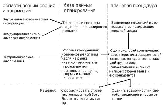 Подсистема информационного обеспечения. Многие неудачи в планировании обусловлены отсутствием необходимой плановой информации (“баз данных”, на основе которых можно принять решение). Часто информация, обрабатываемая в информационных системах банков, носит преимущественно описательно–исторический характер, относящийся к прошлой деятельности его подразделений. Многое из такой информации устарело и связано лишь с ним самим. Чтобы быть полезной для стратегического планирования, информация должна показывать перспективы и быть сосредоточена на тех аспектах окружающей среды и конкуренции, которые в наибольшей мере влияют на будущее банка.