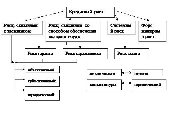 Многие трудности при работе с кредитными рисками обусловлены разнообразием его элементов и видов, множеством причин, воздействующих на кредитную деятельность банка, а в результате, и разнообразием классификаций кредитных рисков. На рисунке 1.1.[3] приведена одна из возможных структур кредитного риска: