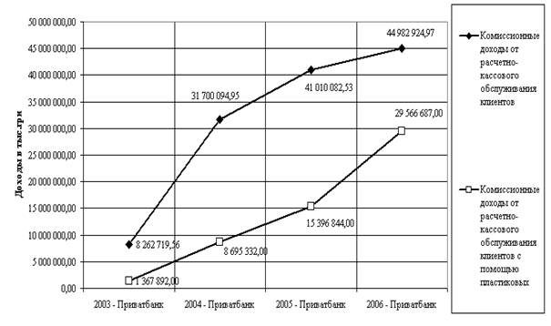 Проведенный анализ динамики и структуры комиссионных доходов АКБ «Приватбанк» в 2003 – 2006 годах показал, что они характеризуются следующими показателями: