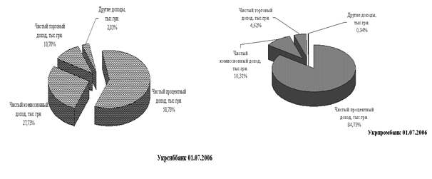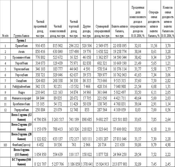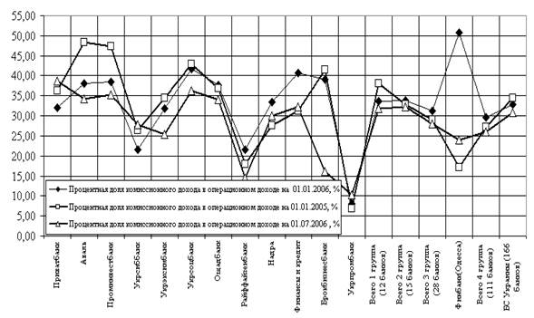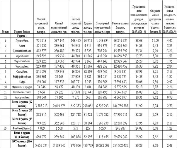 Таблица 2.3 – Структура доходов и характеристики комиссионных доходов в банковской системе Украины по состоянию на 01.07.2006