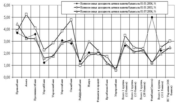 Рисунок 2.2 - Комиссионная доходность активов для основных групп банков Украины по состоянию на 01.10.2005, 01.01.2006, 01.07.2006