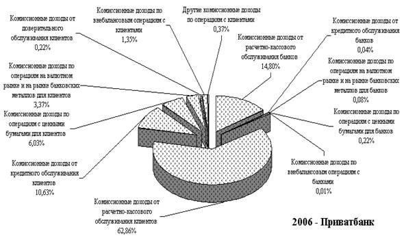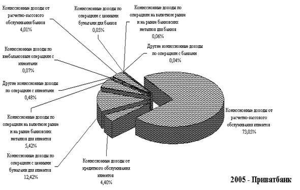 Таким образом, суммарная процентная доля указанных 4-х секторов комиссионных доходов АКБ «Приватбанк» в 2005 – 2006 годах составила 97,6-99,34 % и определяет стратегическое направление развития комиссионных доходов в банке.