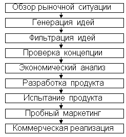 Этот процесс включает этапы от генерации идей до начала коммерческой реализации банковского продукта. В это время банк создает потенциальные варианты, получает представление потребителей о них, оценивает их, устраняет наименее привлекательные, разрабатывает опытные образцы, испытывает их и внедряет на рынке. Основные этапы этого процесса отражены на рис.