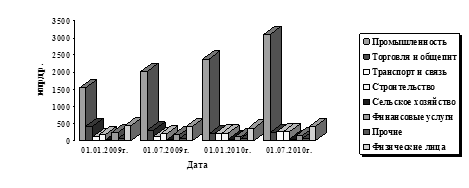 Из приведенных данных видно, что основную долю в клиентском кредитном портфеле банка занимают кредиты предприятиям промышленности, которые за анализируемый период выросли на 1558,1 млрд р., и составили на 01.07.2010г. 3099,4 млрд р. Темп прироста при этом составил 101,1%.