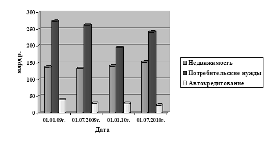 Как видно из рисунка 2.6, кредиты, предоставленные населению на приобретение и строительство недвижимости, имеют тенденцию роста, за исключением незначительного снижения объемов кредитования по состоянию на 01.07.2009г. Темп прироста по данной статье составил 11,4%, что обусловлено увеличением объемов кредитов на недвижимость с 136,3 млрд р. на начало 2009г. до 151,8 млрд р. на первое полугодие 2010г. Также следует отметить равномерное снижение объемов автокредитования, сумма данных кредитов на 01.07.2010г. составила 22,8 млрд р., что на 41,4 процентных пункта меньше в сравнении с началом 2009г. В целом следует отметить, что на протяжении всего 2009г. наблюдалось снижение объемов кредитования физических лиц, в основном за счет уменьшения объема потребительских кредитов, что вероятно связанно с негативными последствиями мирового финансового кризиса, в том числе с девальвацией белорусского рубля в начале 2009 года.