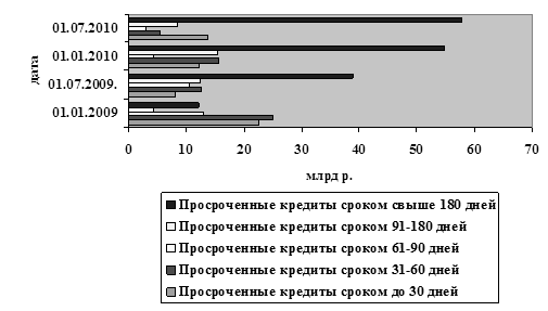 Как свидетельствуют данные таблицы 2.7, на 01.01.2010г. наблюдается значительный рост просроченных кредитов, что непосредственно было связано с воздействием мирового финансового кризиса. На 01.07.2010г. объем просроченных кредитов составил 88,4 млрд р. (на 13,7 млрд р. меньше в сравнении с данными на 01.01.2010г.), что на фоне увеличения объемов кредитного портфеля характеризуется как улучшение качества кредитного портфеля. Темп прироста просроченных кредитов при этом составил 14,8 процентных пункта. Тенденция снижения объема просроченных кредитов является положительной характеристикой деятельности банка по управлению клиентским кредитным портфелем.