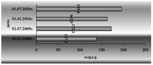 Как видно из приведенных данных, за анализируемый период наблюдается тенденция увеличение объема резерва, его сумма на 01.07.2010г. составила 195,4 млрд р., что на 58,1 млрд р. превышает объем резерва по состоянию на начало 2009г.