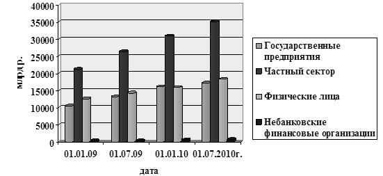 Как видно из приведенных в таблице 3.1 данных, основной объем кредитных вложений приходится на кредиты частному сектору. В абсолютном выражении данная статья увеличилась с 21253,0 млрд р. по состоянии на 01.01.2009г. до 35064,7 млрд р. к 01.07.2010г., то есть темп прироста за анализируемый период составил 65 процентных пункта. В относительном выражении также отмечается равномерная динамика. Удельный вес данной статьи увеличился с 47,5% на 01.01.2009г. до 49,1% к 01.07.2010г.