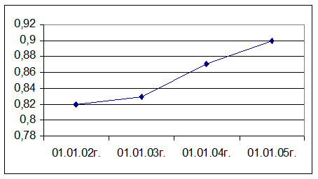 Как видно из табл. 2.5, значение коэффициента на протяжении рассматриваемого периода стремиться к 1 (от 0,82 до 0,90), следовательно, качество кредитного портфеля высокое с точки зрения возвратности. Динамика изменения этого коэффициента изображена на рис.2.7