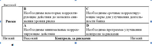 Квадрат D характеризует банк с низким уровнем рисков и вместе с тем с низким уровнем контроля за ними. В такой ситуации также необходимы срочные корректирующие действия, которые позволили бы обеспечить эффективный и качественный контроль за рисками, принимаемыми банком. Программа надзорных органов будет направлена на повышение качества менеджмента, внутреннего контроля, и «надзорный период» будет составлять в зависимости от конкретной ситуации в банке около 1 года.