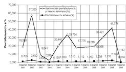 Как показывают результаты, приведенные на рис.2.7, со второй половины 2004 года и на протяжении 2005 года рентабельность собственного капитала в АКБ „Приватбанк” возросла с уровня 10-20% до уровня более 40%, то есть дивидендная доходность акционеров АКБ „Приватбанк” стала постоянно выше альтернативной ставки процентов по депозитам в банковской системе Украины, таким образом инвестирование средств в уставный фонд банка стало выгодным.