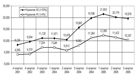 На рис.2.8 приведена динамика нормативов адекватности регулятивного и основного капитала Н2 и Н3 в АКБ „Приватбанк” в 2001-2005 годах. Как пока-зывает анализ, состоянием на начало 2006 года АКБ „Приватбанк” характеризуется как хорошо капитализированный банк [15], у которого: