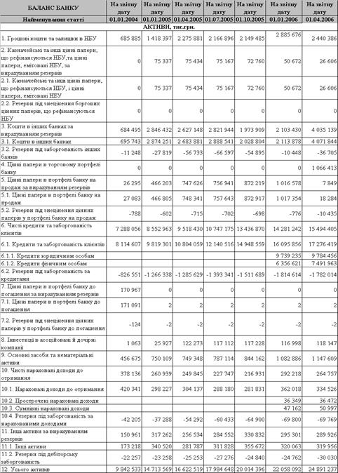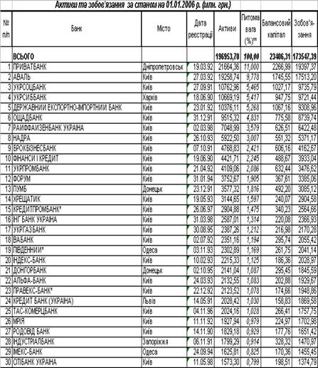 Таблица А.2 Активы и обязательства первых 30 комерческих банков Украины по состоянию на 01.01.2006 года [37]