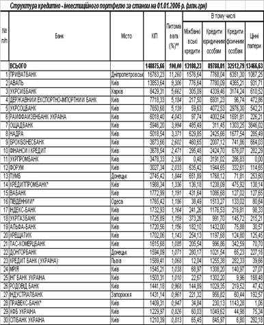Таблиця А.3 Кредитно-инвестиционный портфель первых 30 коммерческих банков Украины по состоянию на 01.01.2006 года [37]