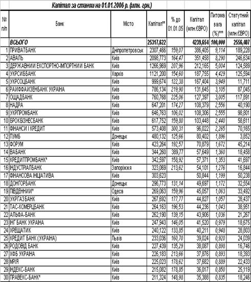 Таблица А.4 Собственный капитал первых 30 коммерческих банков Украины по состоянию на 01.01.2006 года [37]