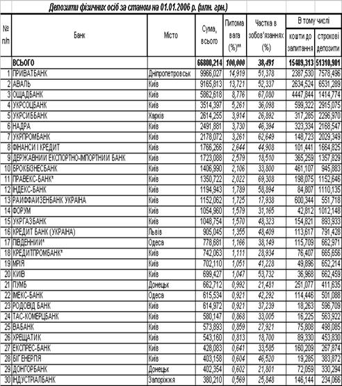 Таблица А.5 Депозиты физических лиц в первых 30 коммерческих банках Украины по состоянию на 01.01.2006 года [37]