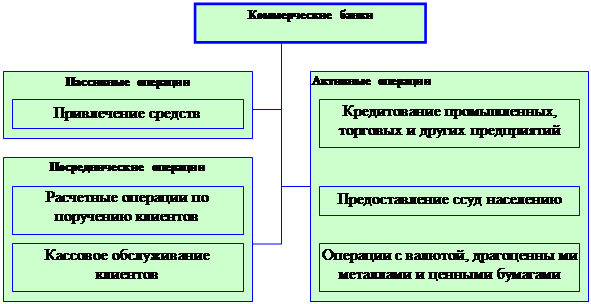 Коммерческие банки (КБ) – кредитные учреждения, создаваемые для привлечения денежных средств (пассивные операции), размещения их от своего имени на условиях возвратности и платности (активные операции) и выполнения поручений клиентов на комиссионных началах (посреднические операции). Основные виды операций КБ представлены на рис. 1.3.