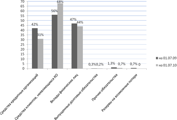 В структуре пассивов уменьшилась доля средств кредитных организаций с 42 до 30%. Наибольший удельный вес в пассивах банка составляют средства клиентов – некредитных организаций, в т.ч. вклады физических лиц. Доля этих средств на 01.07.09 составляла 56%, в июле 2010 увеличилась до 68%. Не изменилась доля прочих обязательств составляющая 1%.