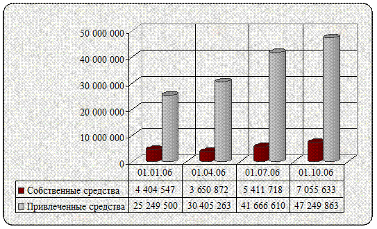 При этом, рост пассивов был вызван, прежде всего, ростом привлеченных средств, размер которых на 1.01.2006 г. был равен 25 249 500 тыс. руб., а на 1.10.2006 г. он возрос на 22 000 363 тыс. руб. и достиг 47 249 863 тыс. руб. Вторым по значению показателем, также оказавшим влияние на рост пассивов в целом, является показатель собственных средств, величина которого на 1.01.2006 г. составляла 4 404 547 тыс. руб., а на 1.10.2006 г. возросла на 2 651 086 тыс. руб. и достигла 7 055 633 тыс. руб. Следует отметить опережение темпа роста привлеченных средств по сравнению с собственными (187,13% и 160,19% соответственно).