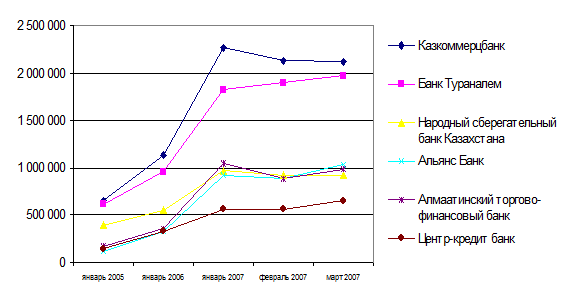 Из рисунка 4 видно, что тройку лидеров по количеству активов возглавляет Казкомерцбанк, на втором месте Банк Тураналем. Необходимо отметить, что увеличение активов практически во всех банках отмечается до начала 2007 года. Далее у всех банков, кроме Банка Тураналем, прослеживается тенденция к снижению активов.