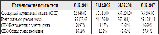 Четвертый коэффициент соотносит размер СНК с размером депозитов. Если в 2004 г. размер СНК был всего 16% от размера депозитов, то в 2007 уже 57%.