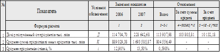 В таблице 2.3.1 приводится факторный анализ процентного дохода. Из таблицы видно, абсолютные отклонения между 2006 г. и 2007 г. по полученному доходу – 113 938 тыс. леев. Проследим насколько повлияли цены кредитов и суммы кредитов на получение конечного отклонения. Из данных таблицы видно, что под влиянием увеличения суммы выданных кредитов на 90,5%, или 804 556 тыс. леев в денежном выражении доход увеличился на 103 806 тыс. леев. Рост же процентной ставки на 0,598% привел к росту дохода на 10 132 тыс. леев.