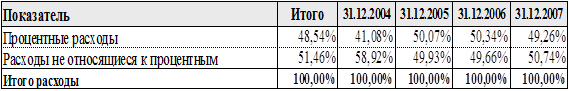 Проведем сходный графический анализ который был использован при анализе доходов. Этот анализ поможет оценить находятся ли соотношение компонентов процентных расходов к общей сумме расходов в той же пропорции к соответствующим компонентам пассива. Анализ так же показывает зависимость банка от специфических источников средств и происходящие в них структурные изменения.