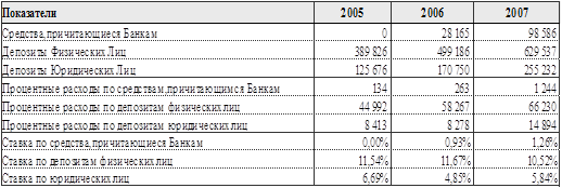 Проанализируем данные таблицы 2.3.3, чтоб дать объяснения сказанному выше. Из таблицы видно, что снижение темпов прироста расходов по депозитам физических лиц связано со снижение стоимости данных депозитов, а так же с уменьшением темпа прироста депозитов. Стоимость же депозитов юридических лиц выросла в 2007 г., а так же существенно выросла доля депозитов юридических лиц.