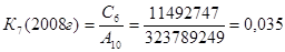 К7 - резервы на покрытие убытков по ссудам. Значение коэффициента не должно быть меньше К6, и в нашем случае оно равно 0,056, 0,039 и соответственно 0,035. Большее значение К7 по сравнению с К6 (0,003<0,056 в 2006 г; 0,004<0,039 в 2007г. и 0,039<0,035 в 2008г.) демонстрирует наличие в кредитном портфеле банка не только низкокачественных кредитов, но и просроченных процентов по кредитам.