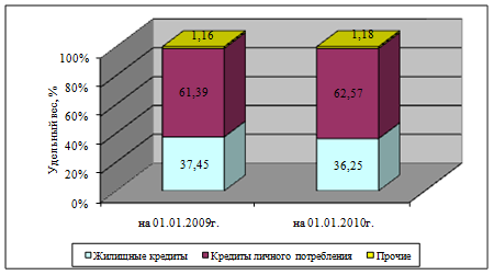 Можно сделать вывод о том, что наибольший удельный вес в составе выданных населению кредитов приходится на кредиты для целей личного потребления и жилищные кредиты. Общее соотношение сохранятся в течение года, но имеют место некоторые структурные сдвиги в сторону увеличения доли жилищных кредитов при одновременном сокращении размера непосредственно так называемого «потребительского» кредита.