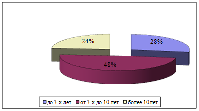 Рис. 11. Структура персонала, обслуживающего заемщиков – физических лиц в Стромынском ОСБ в 2009 г. по стажу профессиональной работы