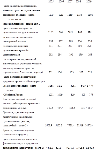 Право эмиссии денег так же возлагается на Центральный банк. Эмиссионный банк становиться центром по организации банковского дела в стране, вокруг которого группируются все прочие банки и иные кредитные учреждения. Первые коммерческие банки были созданы в августе 1988 г. После принятия закона СССР "О кооперации" в 1988 г. объединениям кооперативов предоставлялось право создавать кооперативные банки. В конце 1988 г. было создано 2,5 тысячи кооперативных банков. В апреле 1989г. было разрешено создание акционерных коммерческих банков и коммерческих банков на паевых началах. Основными преимуществами создаваемых коммерческих банков по сравнению с государственными специализированными банками являлись предоставленная свобода в выборе методов ведения банковских операций и прямая зависимость в привлечении клиентов на договорной основе. Перестройка банковской системы путем создания второго уровня в виде самостоятельных коммерческих банков была названа реформой банковской системы начала 90-х годов. Существуют так же другие финансово-кредитные учреждения, являющиеся небанковскими организациями. Небанковская кредитная организация - организация, имеющая право осуществлять отдельные банковские операции, предусмотренные Федеральным законом "О банках и банковской деятельности". Допустимые сочетания банковских операций для небанковских кредитных организаций устанавливаются Банком России. Перечень банковских операций, которые имеют право выполнять в соответствии с имеющейся лицензией кредитные организации, установлен статьей 5 Федерального закона "О банках и банковской деятельности". За период с 2005 по 2009 год в России количество кредитных организаций, которые имеют законодательно обозначенное право на осуществление банковских операций, сократилось с 1299 на начало 2005 года до 1108 на начало 2009 года. Таким же образом сократилось количество учреждений, имеющих лицензию на прием депозитов населения: с 1165 на начало 2005 года, до 886 на начало 2009 года. В тоже самое время количество учреждений с иностранным капиталом увеличилось с 131 на начало 2005 года, до 221 на начало 2009 года. При этом зарегистрированный уставной капитал действующих кредитных организаций увеличился в 2.3 раза за период с 2005 по 2009 год: с 380,5 млн.рублей в 2005 году, до 881,4 млн.рублей в 2009 году.