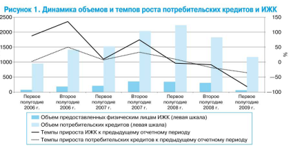 В рассматриваемый период кредитными организациями предоставлено 44045 ИЖК на общую сумму 55,4 млрд. руб. или 4,7% от общего объема потребительских кредитов. Средний размер предоставленных кредитов составил 1,3 млн. руб. По сравнению с соответствующим периодом 2008 г. Объем предоставленных в первом полугодие 2009 г. ИЖК сократился в 6,1 раза, фактически вернувшись к уровню аналогичного периода 2006 г. Причем если в первом полугодии 2006 г. Темпы прироста ИЖК в 2 раза превышали темпы прироста потребительских кредитов, а в соответствующие годы 2007 и 2008 гг. указанные показатели были почти одинаковыми, то в первом полугодии 2009 г темпы прироста потребительских кредитов в 3,6 раза превысили темпы ИЖК.