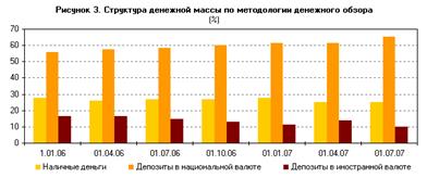 В структуре рублевой денежной массы доля наличных денег в обращении на 1.07.2007 сократилась относительно 1.01.2007 на 3,1 процентного пункта (до 27,9%), удельный вес депозитов "до востребования" повысился на 2,4 процентного пункта (до 33,7%), а срочных депозитов — на 0,7 процентного пункта (до 38,5%).