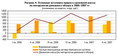 Темпы прироста денежной массы по методологии денежного обзора в январе—июне 2007 г. составили 18,6% (в аналогичный период 2006 г. — 15,0%). Прирост чистых иностранных активов банковской системы, как и в 2006 г., оставался важным источником увеличения этого денежного агрегата. При его росте почти на 1,9 трлн. руб. (в январе—июне 2006 г. — на 1,1 трлн. руб.) чистые иностранные активы увеличились более чем на 1,8 трлн. руб. (в первом полугодии 2006 г. — на 1,4 трлн. руб.), а внутренний кредит экономике — на 0,5 трлн. руб. (в январе—июне 2006 г. он сократился на 0,2 трлн. руб.). При этом в первом полугодии 2007 г. по сравнению с аналогичным периодом 2006 г. возросло значение такого источника денежного предложения, как банковские кредиты нефинансовым организациям и населению. Требования к этой группе заемщиков в целом за первое полугодие 2007 г. возросли на 1,9 трлн. руб. (за аналогичный период 2006 г. — на 1,1 трлн. руб.). Сдерживающее влияние на рост денежной массы, так же как и в 2006 г., оказывало накопление средств на счетах органов государственного управления в Банке России, главным образом на счетах Стабилизационного фонда Российской Федерации.