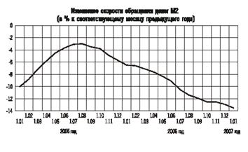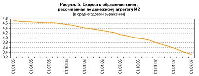 Скорость обращения денег, рассчитанная по денежному агрегату М2 в среднегодовом выражении, снизилась за первое полугодие 2007 г. на 12,8% (за аналогичный период 2006 г. — на 6,1%). Уровень монетизации экономики (по денежному агрегату М2) за январь—июнь 2007 г. увеличился с 26,2 до 30,1%.