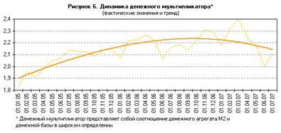 Соотношение темпов роста денежной массы М2 и денежной базы в широком определении обусловило уменьшение денежного мультипликатора с 2,183 на 1.01.2007 до 2,114 на 1.07.2007, или на 3,2% (за первое полугодие 2006 г. он возрос на 4,0%).