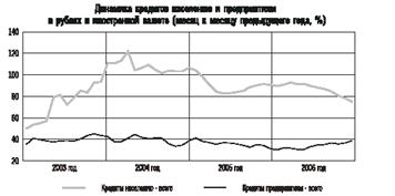 В результате увеличения объемов банковского кредитования и повышения доходов нефинансовых организаций, а также вследствие накопления нефинансовыми организациями средств на текущих счетах (для участия в аукционных процедурах, в том числе по продаже активов ОАО "НК ЮКОС") общий объем средств на их счетах в кредитных организациях возрос за январь—май 2007 г. на 39,0% (за аналогичный период 2006 г. — на 12,8%). В июне объем средств на указанных счетах уменьшился, что было обусловлено завершением аукционных операций и выплатами в бюджет задолженности НК "ЮКОС". В итоге за первое полугодие 2007 г. банковские вклады предприятий увеличились на 35,3%. В составе депозитов организаций объем депозитов "до востребования" увеличился на 34,2%, а срочных депозитов — на 38,3% (в первом полугодии 2006 г. аналогичные показатели возросли на 20,3 и 22,4% соответственно). Таким образом, темпы роста депозитов нефинансовых организаций в 2007 г. более чем в два раза превышали темпы роста депозитов населения (на 17,7 процентного пункта), в то время как в аналогичный период 2006 г. превышение составляло лишь 0,8 процентного пункта.