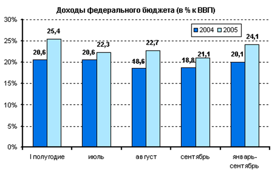 Динамика поступлений доходов в федеральный бюджет РФ в январе-сентябре 2004-2005 гг. представлена на диаграмме ниже[1].