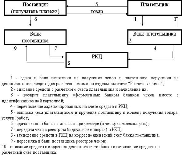 «Зачисление средств на счет чекодержателя производится обслуживающим его банком только после поступления средств от чекодателя и обслуживающего его банка. Расчеты между банками чекодателя и чекодержателя идут через МЦИ и ЦБР. Правила совершения таких расчетов следующие. Главные территориальные управления ЦБР возлагают проведение операций по расчетам чеками внутри города на какой-либо один МЦИ. В этом МЦИ каждому коммерческому банку открывается отдельный счет на балансовом счете. На этот счет коммерческие банки должны перечислять все суммы, которые задепонированы их клиентами.