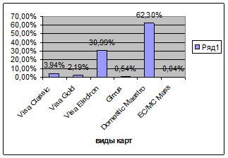 Из данной диаграммы видно, что банковская карта Domestic Maestro самая популярная. И вообще на сегодняшний день банковские карты является наиболее распространенными в перечисление денежных средств и в других операциях банка.