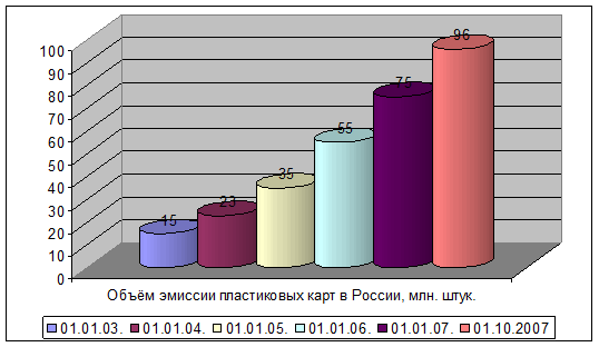 Всего за пять лет количество банковских карт в России увеличилось более чем в 6,4 раза. По данным Центробанка на 01.10.2007 г., в стране выпущено 96 222 тыс. банковских карт, а объем операций по ним достиг более 5 триллионов рублей[30].