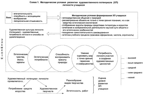 Равномерное развитие пяти потенциалов — основной способ воспитания гармоничной личности. На сегодняшний день проблема развития художественного потенциала учащихся в процессе обучения биологии остается недостаточно разработанной, в то время как данный курс обладает широкими возможностями развития именно художественных способностей личности. Эти возможности вытекают из самой сути естественных наук, центральной проблемой которых являются взаимоотношения в системе "природа — человек". Данный вопрос рассматривается в работах методистов А.С. Волковой, В.М. Корсунской, Н.М. Верзилина; в формулировке "эстетическое воспитание учащихся" ими определены основные методические условия, реализация которых направлена на формирование художественной культуры школьников (схема 1).