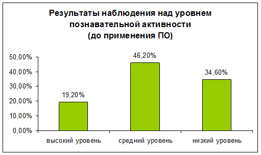В течение учебной недели за детьми на уроках осуществлялось наблюдение. В бланке наблюдения (см. Приложение 4) отмечалось количество заданных вопросов ребенком, количество поднятых рук ребенком, количество высказываний, имеющих целенаправленный характер, количество реплик, количество выполненных самостоятельно заданий, а также отвлекаемость учащихся. По прошествии недели была подсчитана активность детей и их отвлекаемость. Результаты внесены в таблицу. В таблице указаны средняя за все время наблюдения активность и отвлекаемость и сделан вывод об уровне отношения детей к учебе (см. Приложение 5). Результаты представлены в диаграмме: